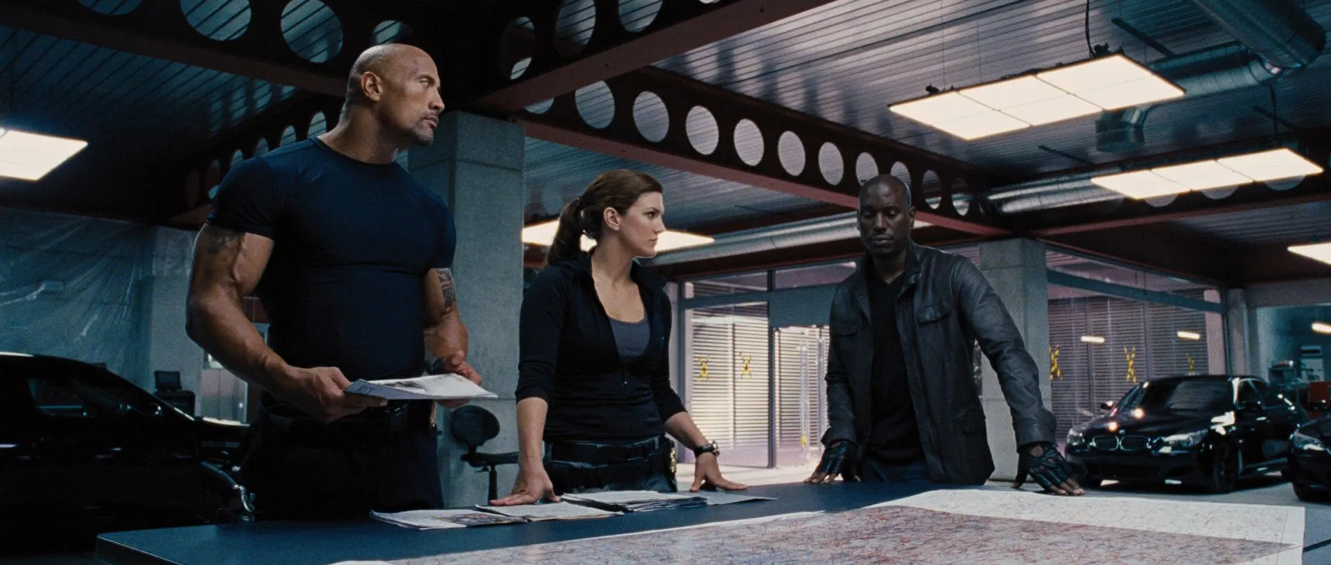 Cast: Vin Diesel as Dominic Toretto, Paul Walker as Brian O'Conner, Dwayne Johnson as Luke Hobbs, Jordana Brewster as Mia Toretto, Tyrese Gibson as Roman Pearce, Ludacris as Tej Parker, Matt Schulze as Vince, Sung Kang as Han Lue, Gal Gadot as Gisele Yashar, Tego Calderon as Tego Leo, Don Omar as Rico Santos, Joaquim de Almeida as Hernan Reyes, Elsa Pataky as Elena Neves, Michael Irby as Zizi, Fernando Chien as Wilkes, Alimi Ballard as Fusco, Yorgo Constantine as Chato, Geoff Meed as Macroy, Joseph Melendez as Chief of Police Alemeida, Jeirmarie Osorio as Rosa, Mark Hicks as Capa, Esteban Cueto as Berto, Corey Michael Eubanks as Lanzo, Luis Da Silva Jr. as Diogo, Eva Mendes as Monica Fuentes (uncredited), Luis Gonzaga as Cash House Door Guard (uncredited), Benjamin Blankenship as Lead DEA Agent (uncredited), Jay Jackson as Field Reporter (uncredited), Arlene Santana as Field Reporter (uncredited), Kent Shocknek as News Anchor (uncredited), Sharon Tay as News Anchor (uncredited), Devon Aoki as Suki (archive footage) (uncredited), Johnny Strong as Leon (archive footage) (uncredited), Chad Lindberg as Jesse (archive footage) (uncredited), Gregory Marshall Smith as Henchman / Train Passenger / Prison Guard (uncredited)